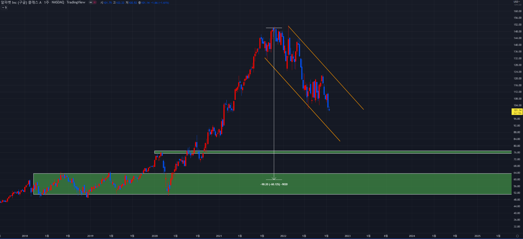 과거 2007년의 고점에서 2008년의 저점까지 -60%하락했던 사실을 현 시점에 대입해본다면 $150달러의 고점에서 -60%하락한다면 $60대에 도달하게 되고 이 영역은 과거 2018~2020년까지 박스권이 형성되어 매물대가 두꺼운 영역입니다.