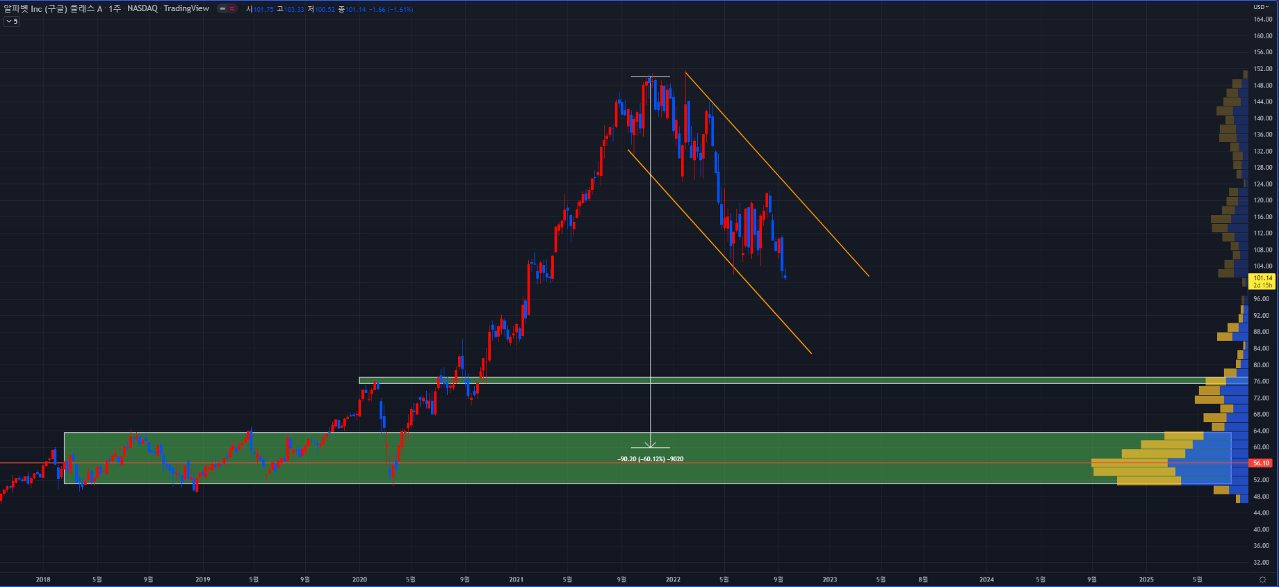 과거 2007년의 고점에서 2008년의 저점까지 -60%하락했던 사실을 현 시점에 대입해본다면 $150달러의 고점에서 -60%하락한다면 $60대에 도달하게 되고 이 영역은 과거 2018~2020년까지 박스권이 형성되어 매물대가 두꺼운 영역입니다.
